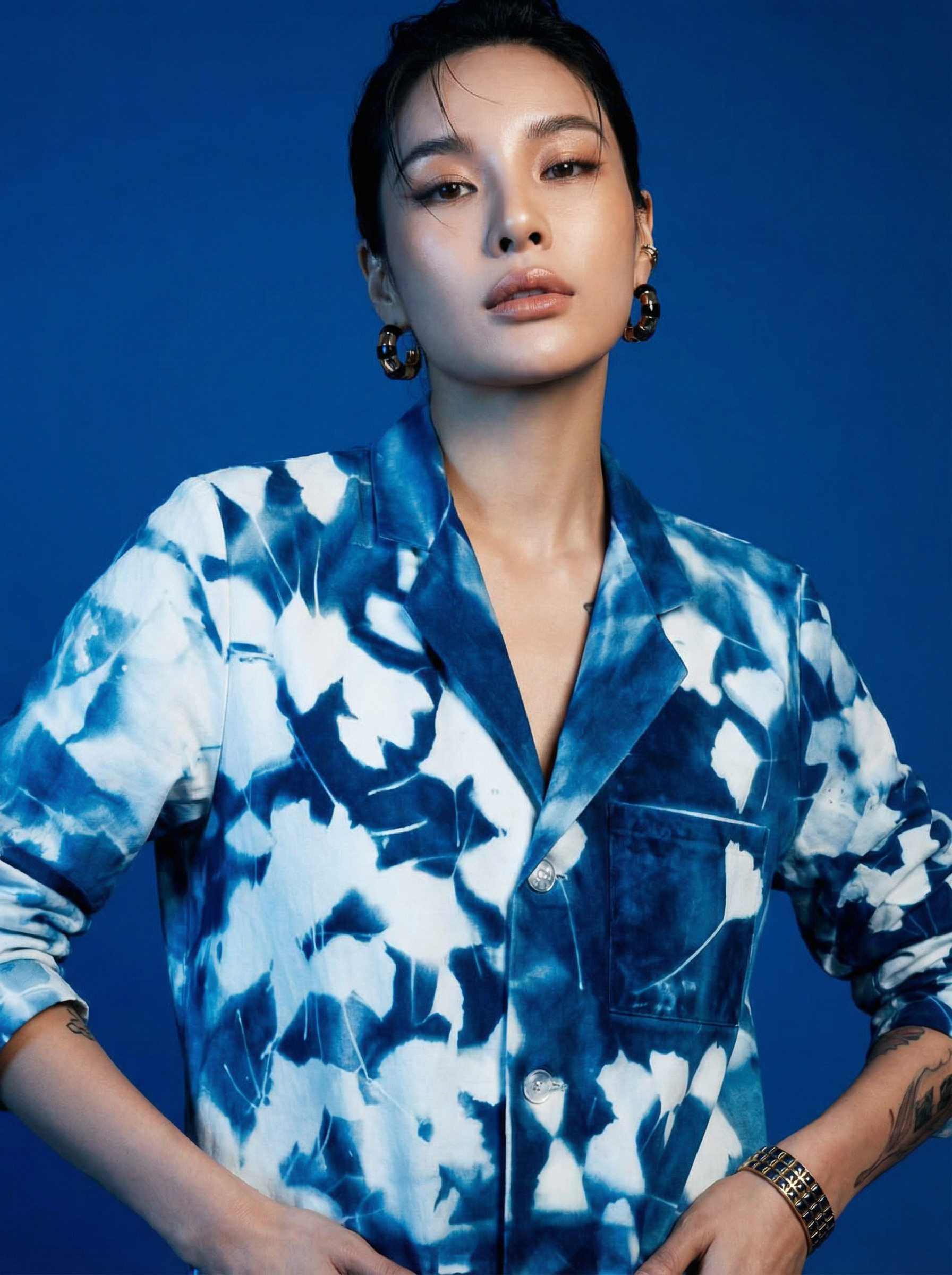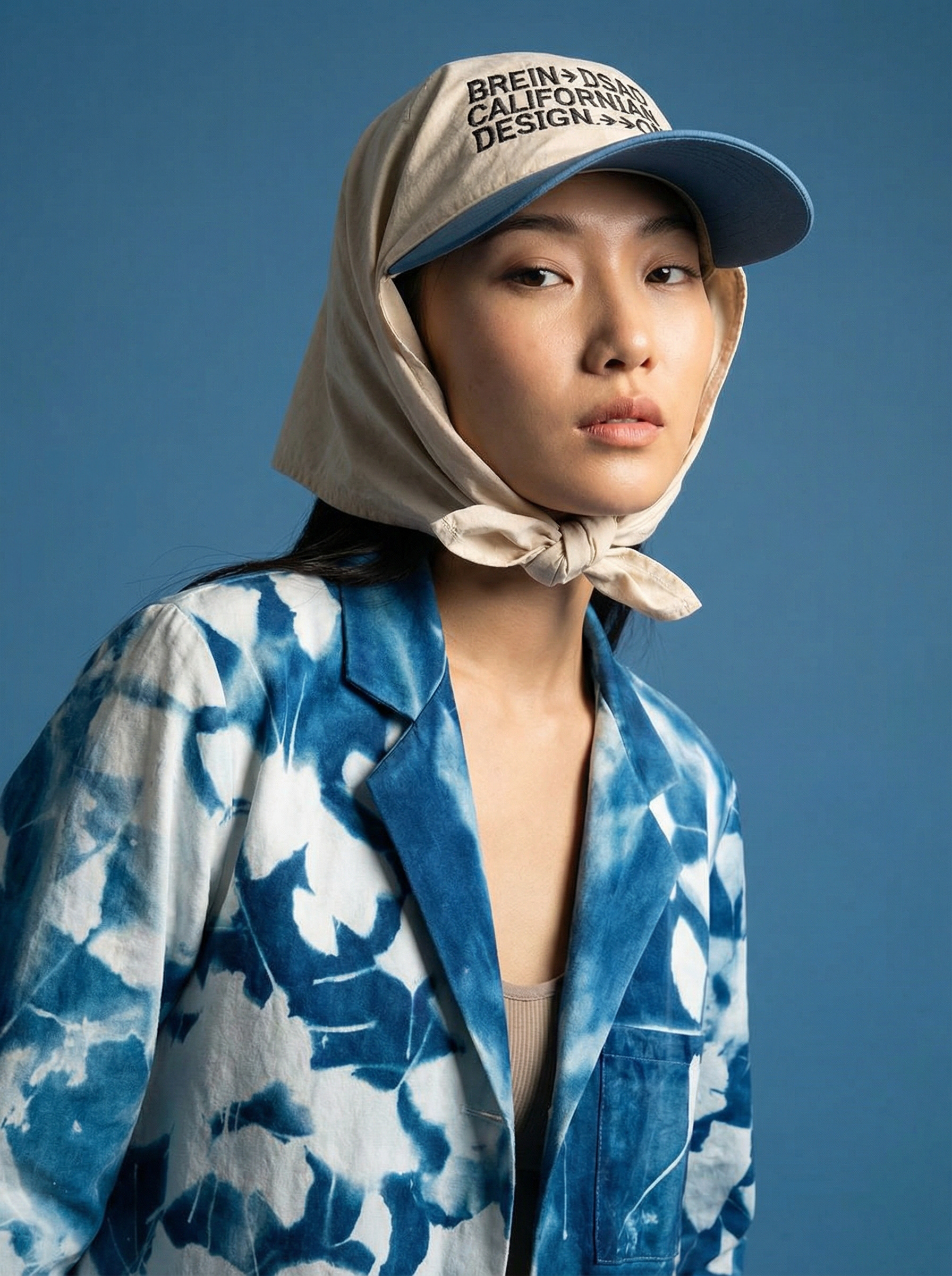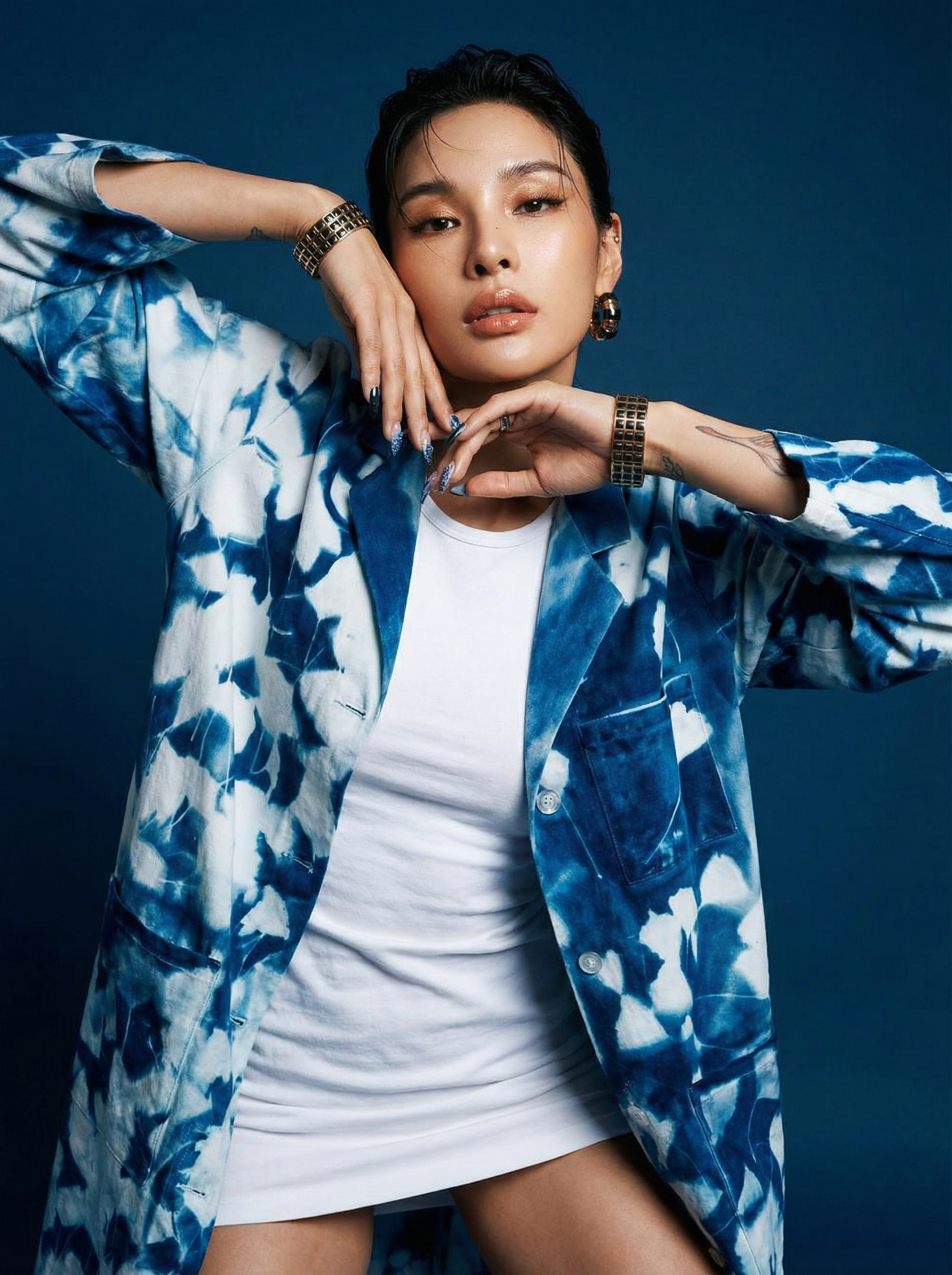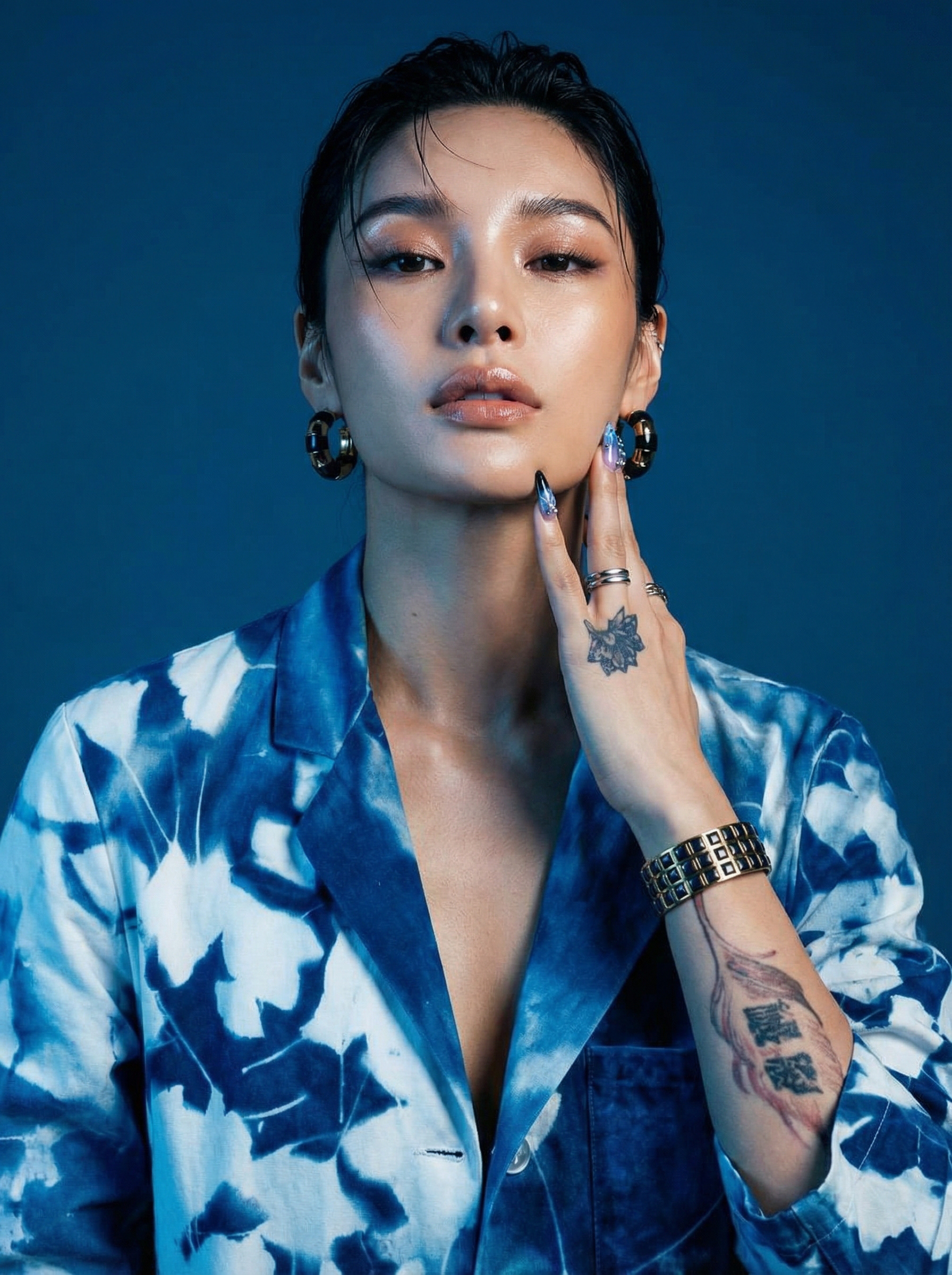 Uso de referencia de Modelo solo para testeo de consistencia en rostro, maquillaje, prenda, accesorios y tatuajes con la misma estética de la campaña BLUE.