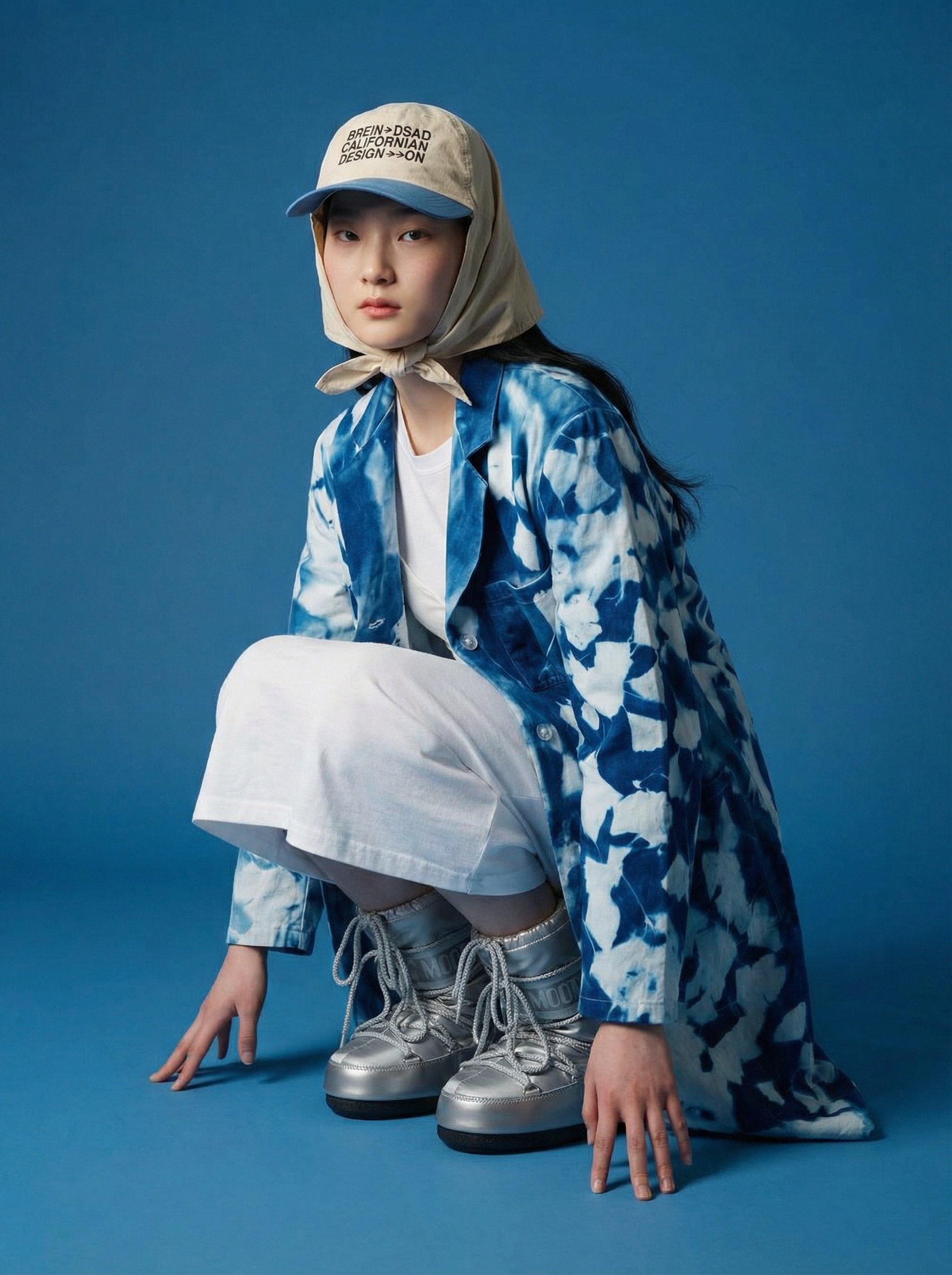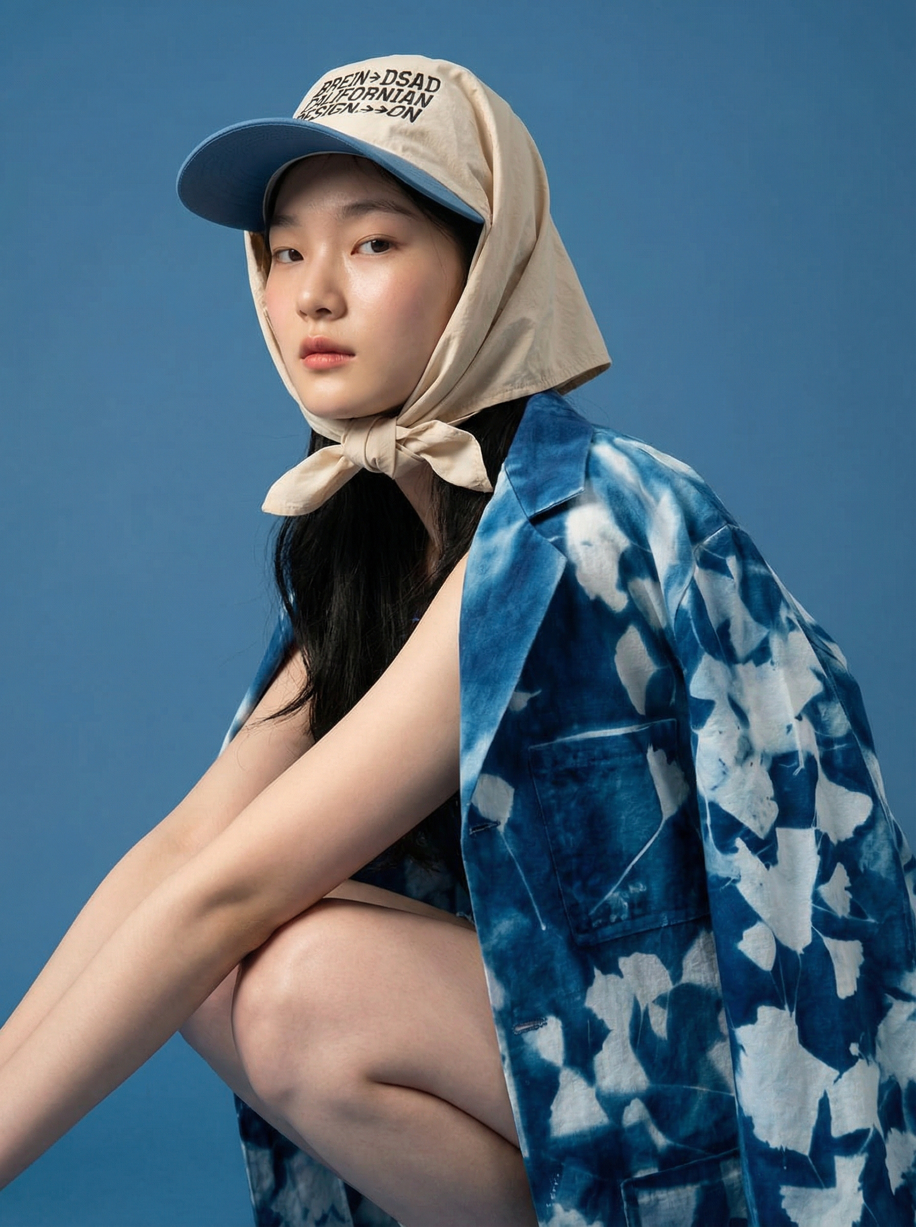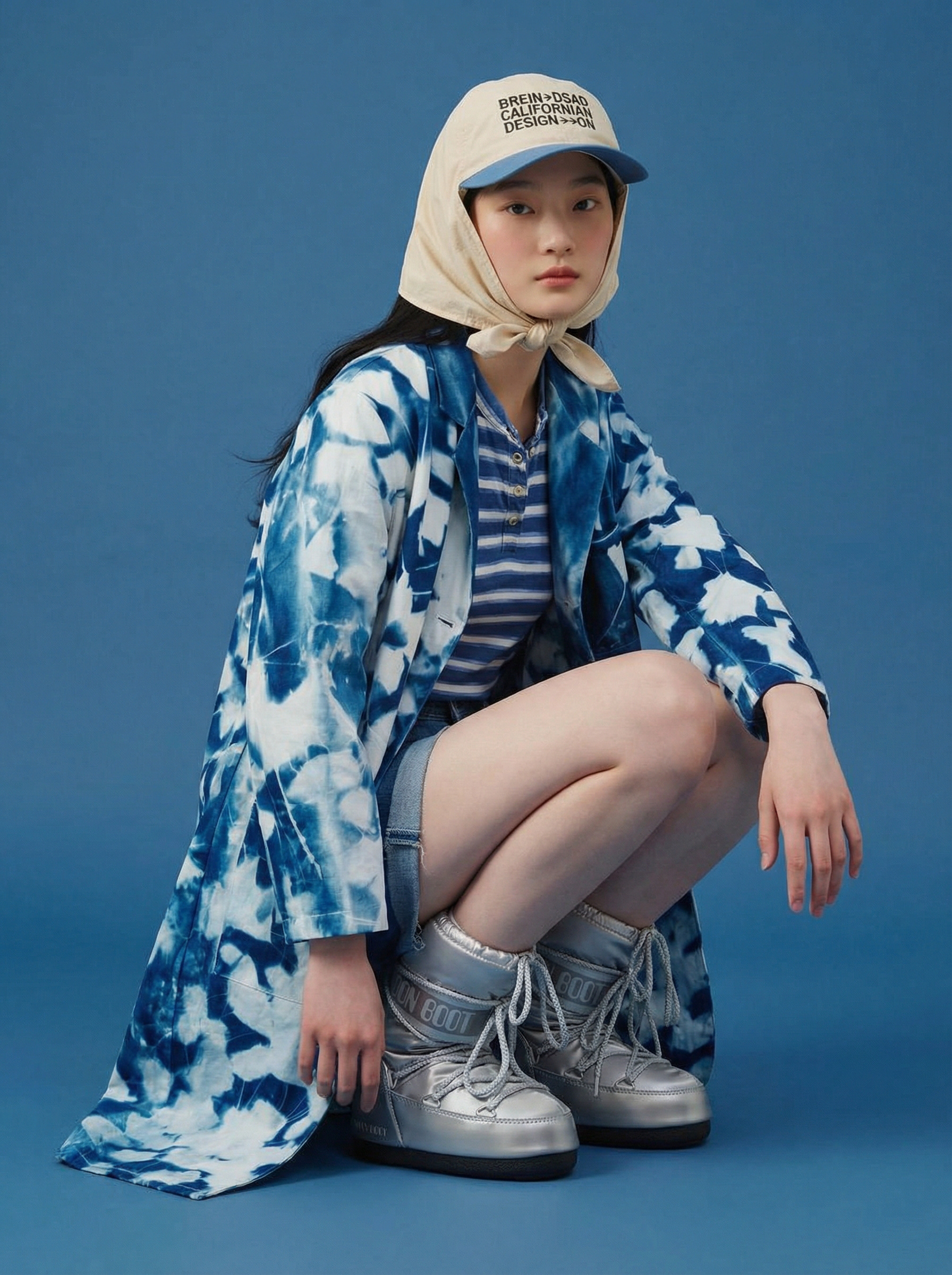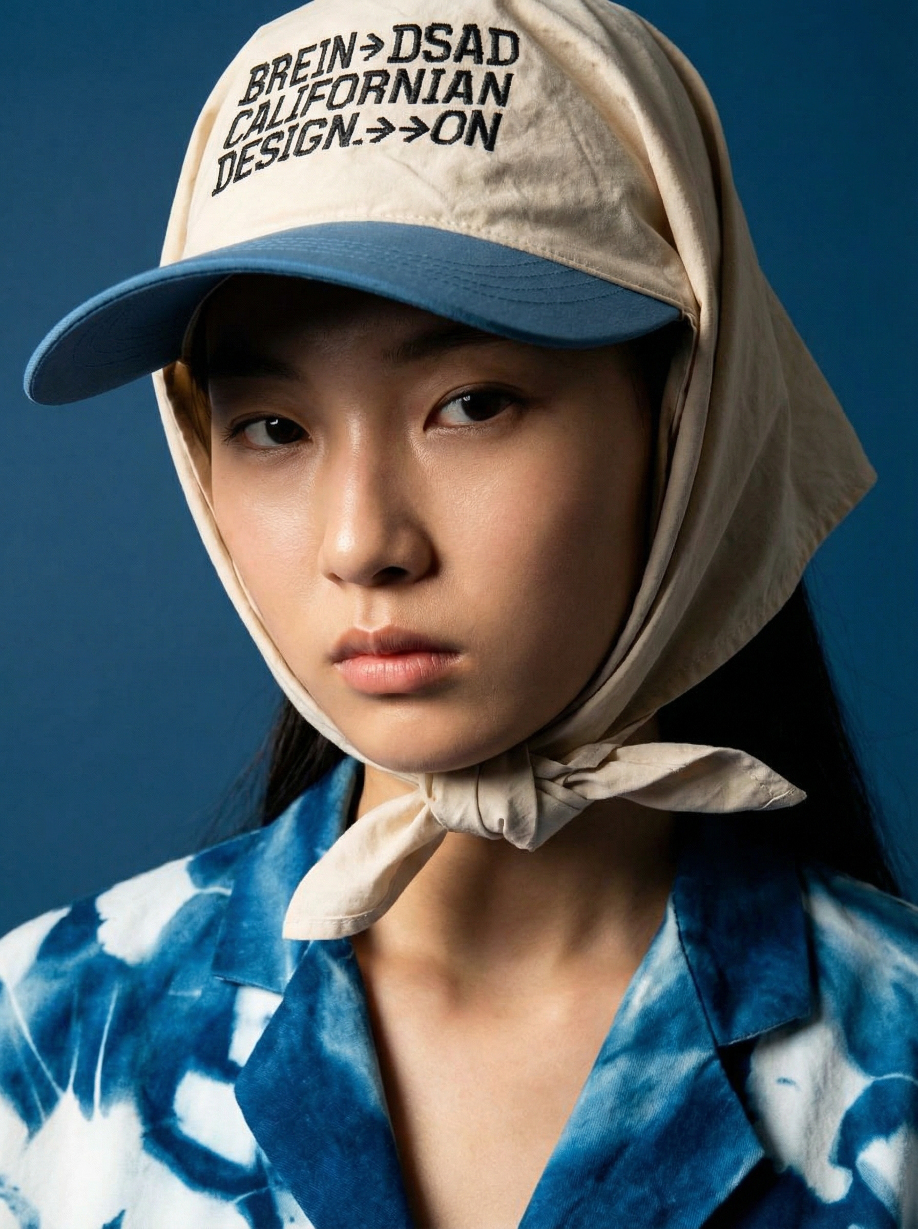 Uso de referencia de Modelo solo para testeo de consistencia en rostro, maquillaje, prenda, accesorios y tatuajes con la misma estética de la campaña BLUE.